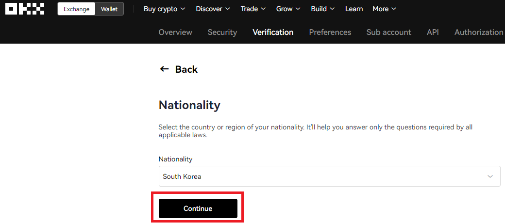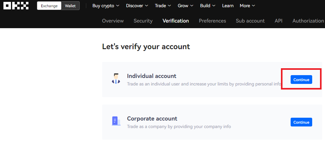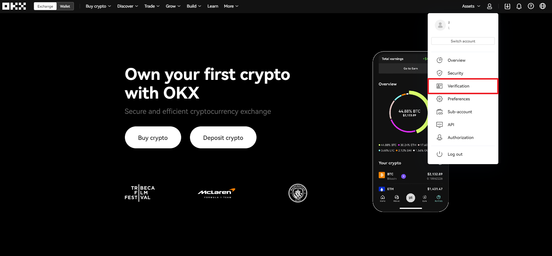 okx 거래소 상단 탐색 표시줄에 있는 계정 프로필 아이콘으로 이동합니다. 아이콘을 클릭하고 메뉴에서 " Verification"을 선택합니다.