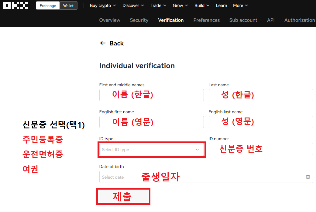 OKX 앱에서 프로필 아이콘을 선택후 메뉴에서 "Identity verification"을 선택합니다.