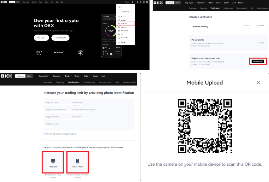 상단 계정 프로필 아이콘을 클릭후 메뉴에서 3번째 신원확인을 선택하여 "ID photo and investment info"를 선택하여 고급인증을 진행하시면 됩니다. 웹캡이 있으신분은 웹캡으로 신분증 앞면과 얼굴을 촬영하여 제출하시면 되고 웹캡이 없으신분은 휴대폰으로 촬영하시면 되는데요 QR스캐너 같은 앱으로 okx에서 알려주는 QR코드를 스캔하여 아래처럼 링크에 들어가서 진행해 주시면 됩니다.